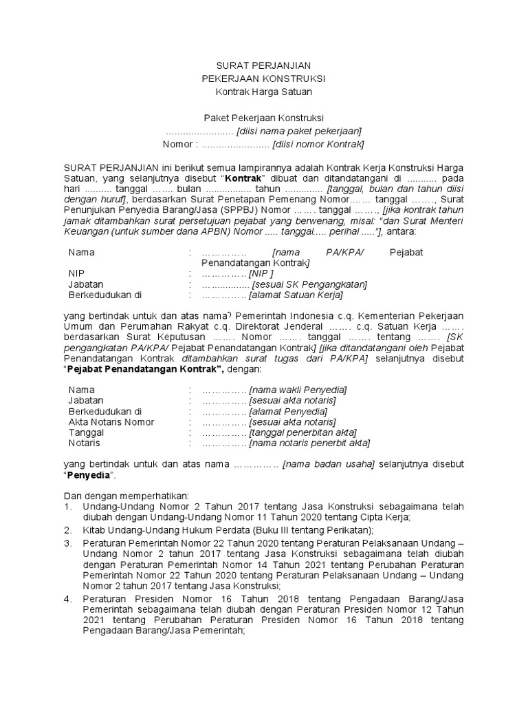 Surat Perjanjian Pekerjaan Konstruksi Harga Satuan 2021 Pdf